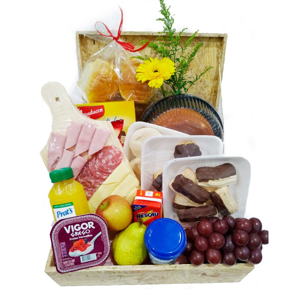 A cesta ouro é composta por 1 galho de flor da estação, 2 tipos de pães, 1 torrada, 2 tipos de bolachas caseira, 1 bolo, 1 tabuas de frios, 1 iogurte, 1 bebida láctea, 1 requeijão, 1 suco, 3 tipos de frutas (frutas da estação)